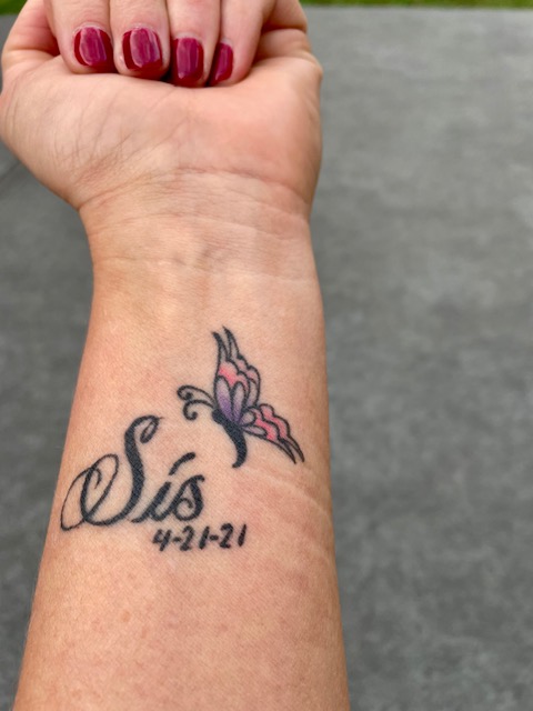 So, long story short, my first interviewee for my chat is myself! The tat is of a butterfly: butterflies were TT’s favorite. She had butterfly figures, clothes with butterflies, and our course a tattoo. I debated about what word to get to go with the butterfly. Words that I considered that were very fitting were hero and hope. But chose “Sis”… That was her word for me. Every time we talked and ended a conversation, she would always say “hey sis or love you sis”. 😊 I can hear her voice now calling me Sis. Why did I choose the left hand, bottom side of the wrist? I wanted to see it, all the time and anytime. I am right-handed so I knew that if I was working on the computer or writing, all I had to do was to turn over my left hand and there it is, for ME. I wanted to be reminded of her and the hero she was. I love looking at the tattoo and remembering the promise that I made to her. I love the tattoo and maybe there will be a #28? Hmmm, I’m not sure but “never say never”.